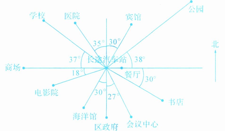 2. 看圖,以長途汽車站為觀測點,把你了解到的信息填在橫線上。