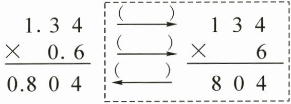 對于$1.34×0.6$,首先將$1.34$擴大$100$倍變為$134$,將$0.6$擴大$10$倍變為$6$,此時算式轉化為$134×6$,計算出結果后,因為因數$1.34$和$0.6$一共有$3$位小數,所以從積$804$的右邊起數出$3$位,點上小數點,即$0.804$。