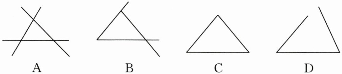 1. 下列選項中的圖形都是由三條線段組成的,其中符合三角形概念的是(
