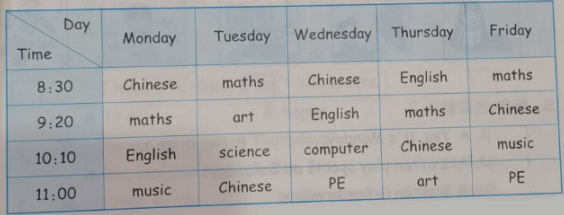 解析:星期三有語(yǔ)文、英語(yǔ)、電腦和體育課,故答案為Wednesday, Chinese, computer。